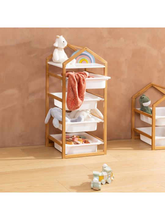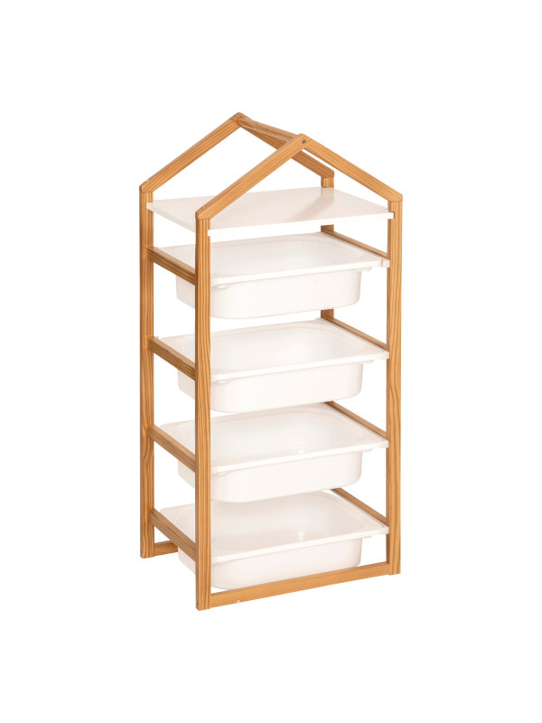 Konstrukcja regału wykonana jest z wysokiej jakości drewna sosnowego oraz MDF, co zapewnia trwałość i stabilność. Pojemniki z polipropylenu są nie tylko odporne na uszkodzenia, ale również łatwe do czyszczenia, co ułatwia utrzymanie porządku. Estetyczny design regału w formie domku dodaje uroku dziecięcym wnętrzom, a biały kolor z naturalnymi akcentami drewnianymi sprawia, że pasuje do różnych aranżacji.