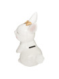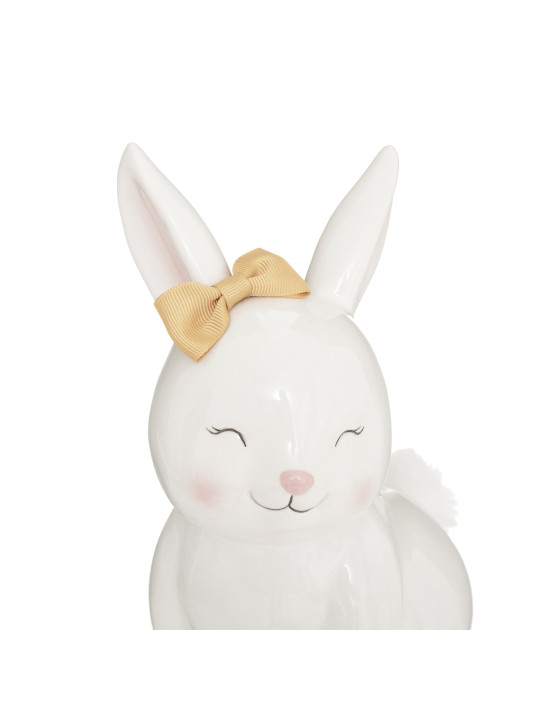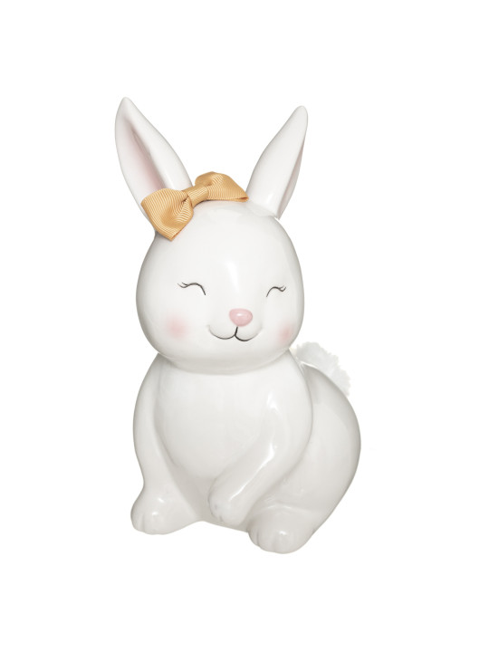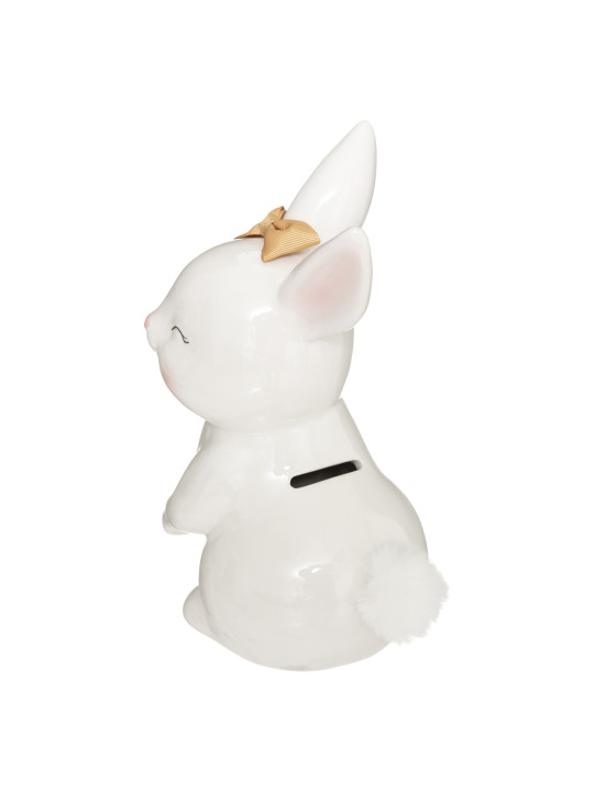 Skarbonka zachwyca radosnym wyglądem - biały kolor w połączeniu z kontrastową żółtą kokardą oraz długimi, sterczącymi uszkami i ślicznym ogonkiem przyciąga wzrok i wywołuje uśmiech na twarzy każdego dziecka. Dzięki odpowiednim wymiarom (wysokość 22 cm, szerokość 10,8 cm, długość 14 cm) jest idealna do małych rączek, co sprawia, że dzieci mogą łatwo korzystać z niej podczas nauki oszczędzania.