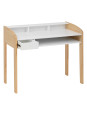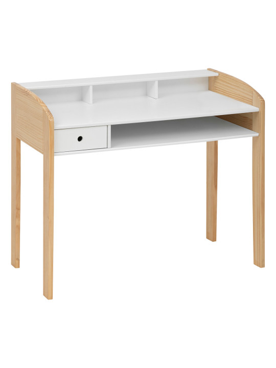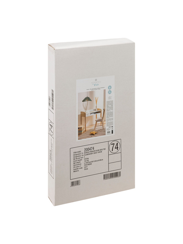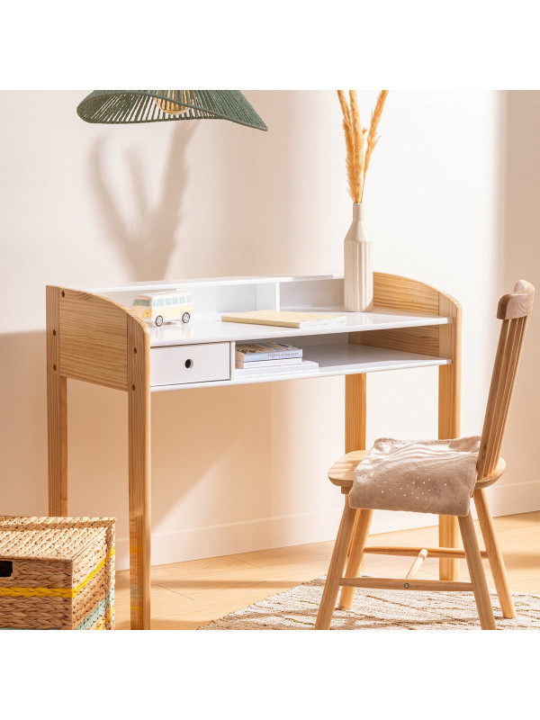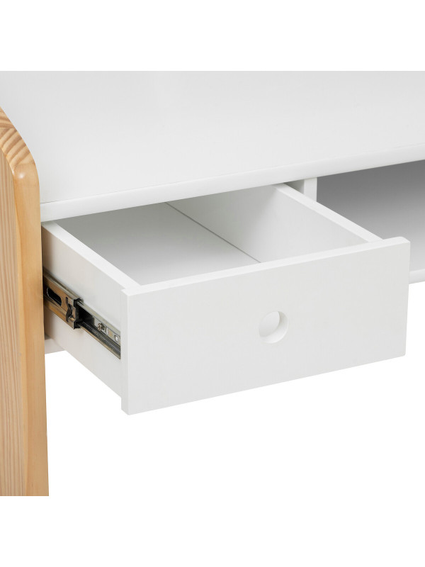 Biurko wyróżnia się ergonomicznym designem, który doskonale wpisuje się w skandynawskie wnętrza. Zaokrąglone linie i prosta forma wprowadzają do pokoju ciepło i harmonię, tworząc przyjemną atmosferę sprzyjającą skupieniu. Wykonane z płyty meblowej z wodoodporną powłoką oraz nogami z recyklingowanego drewna, biurko zapewnia trwałość i bezpieczeństwo użytkowania, co jest niezwykle istotne w przypadku mebli dla dzieci.