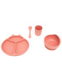 Przedstawiamy silikonowe naczynia dla dzieci, które stanowią idealne rozwiązanie na codzienne posiłki. W skład zestawu wchodzi talerz, miseczka, kubek oraz łyżeczka, co czyni go kompletnym wyposażeniem dla najmłodszych. Dzięki temu rodzice mogą być pewni, że ich dzieci mają wszystko, co potrzebne do zdrowego i smacznego jedzenia.